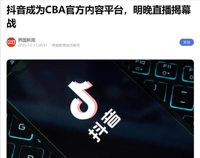 12月11日晚8点,CBA官方发布公告,宣布与抖音集团达成战略合作。