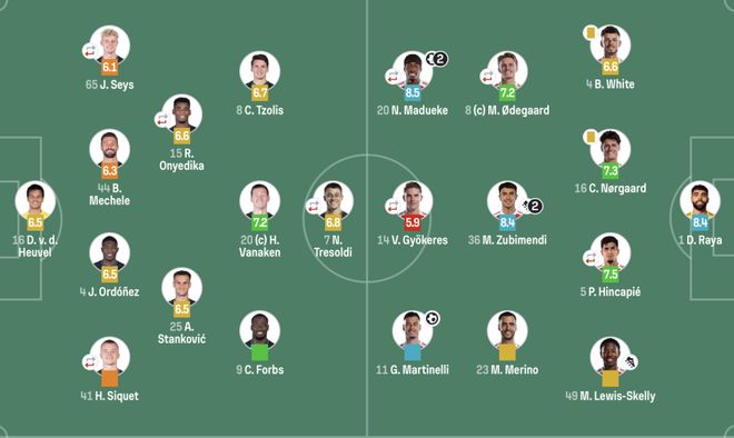 阿森纳(433):1-拉亚;4-怀特(83’89-萨尔蒙),16-诺尔高,5-因卡皮耶(63’33-卡拉菲奥里),45-斯凯利;8-厄德高(71’22-恩瓦内里),36-苏维门迪,23-梅里诺;25-马杜埃凯(71’7-萨卡),14-哲凯赖什(62’9-热苏斯),11-马丁内利