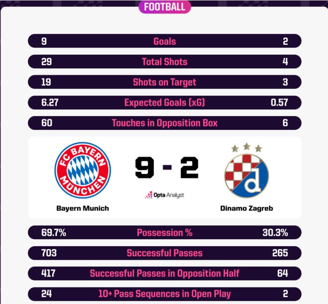 拜仁慕尼黑 9 - 2 萨格勒布迪纳摩 —— 2024年9月17日